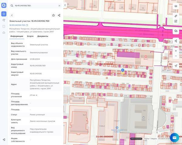 Земельный участок, кадастровый (условный) номер 16:45:040106:769, площадь 24,11 кв.м. с гаражом, кадастровый (условный) номер 16:45:040106:9970, место нахождения: Россия, Респ Татарстан, г Альметьевск, ул Шевченко, площадь 20,7 кв.м.