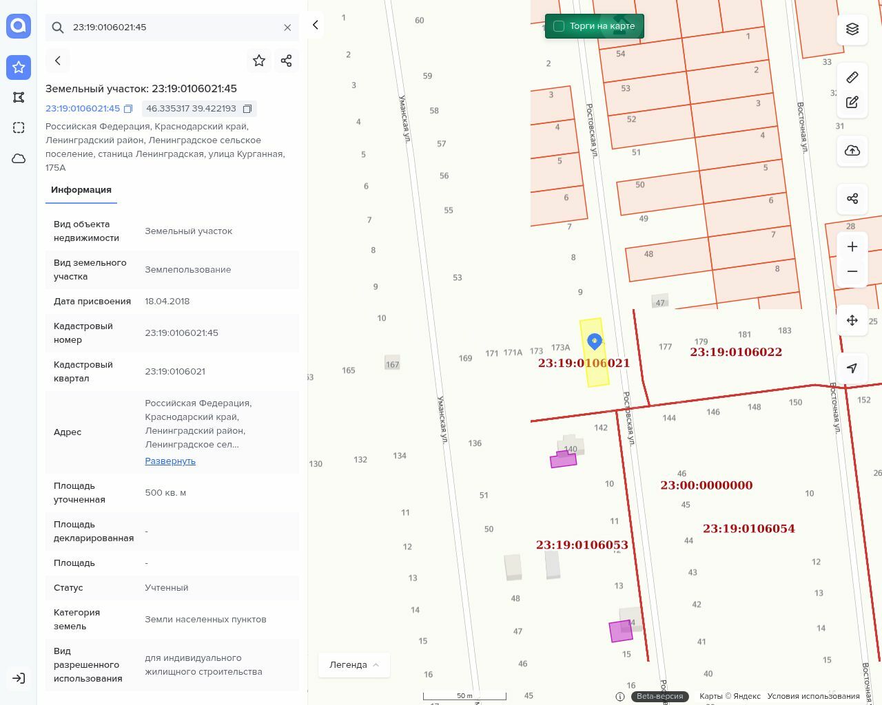 ✅ Земельный участок, площадь: 500 кв.м. Земли населенных пунктов, разрешенное использование: для индивидуального жилищного строительства, кадастровый номер: 23:19:0106021:45